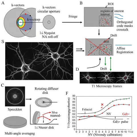 - What it does: Each microarray spot on the diamond is spatially/temporally coded with a unique fringe signature. NV T₁ changes (from Gd³⁺ displacement when a target binds) modulate the amplitude/phase of that code. A single camera shot (or a few) is enough to demix all 49 sites.