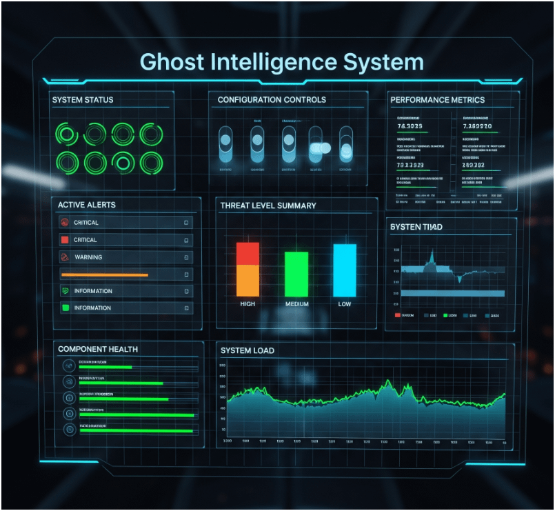 Picture this: RF signals flow in, get processed in parallel by the LatentAggregator (for ghost-space) and OrbitalMimicDetector, then fused in the central GhostIntelligenceSystem. Telemetry tracks everything—latencies, health stats—updated every 100ms for an operational dashboard that looks straight out of a command center (complete with live feeds, toggles, and CPU graphs).