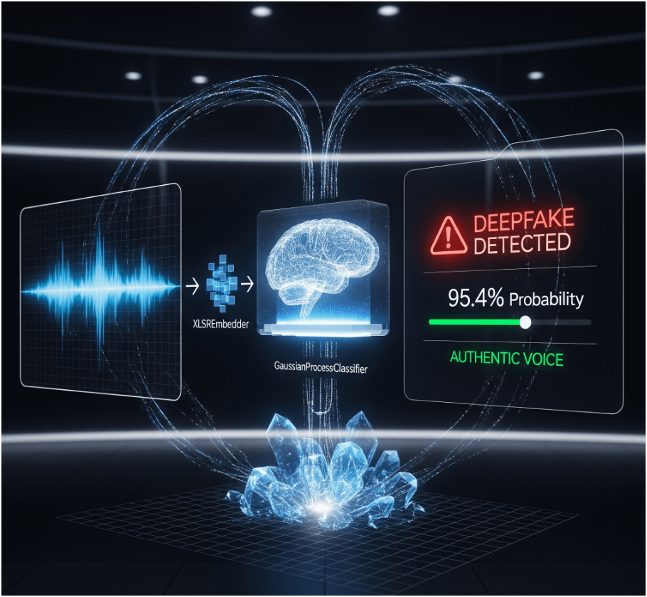 - Using a Radial Basis Function (RBF) kernel with an optimized length scale (ℓ=1.5), the system classifies audio as real or fake via Laplace approximation for probabilities.