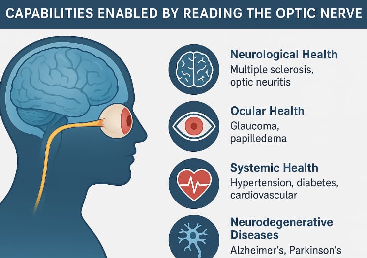 Reading the optic nerve enables critical insights into neurological, ocular, and systemic health due to its direct connection to the brain and role in visual processing. The optic nerve is integral in transmitting visual signals from the retina to the brain, and analyzing it can reveal conditions like glaucoma, optic neuritis, and papilledema (swelling due to intracranial pressure). Beyond eye health, its evaluation offers a window into broader neurological disorders, including multiple sclerosis, where optic nerve inflammation often serves as an early symptom. Advancements in imaging technologies like Optical Coherence Tomography (OCT) allow detailed assessments of optic nerve fibers, enabling early detection of neurodegenerative diseases such as Alzheimer’s or Parkinson’s by identifying changes in nerve thickness or retinal ganglion cells. The optic nerve also reflects systemic health, as vascular changes visible in its structure can indicate hypertension, diabetes, or cardiovascular issues. Moreover, in medical research, studying the optic nerve contributes to understanding neural connectivity and regeneration, providing insights into potential treatments for blindness or nerve damage. Its non-invasive accessibility makes it a valuable diagnostic tool across disciplines, bridging ophthalmology, neurology, and general medicine.