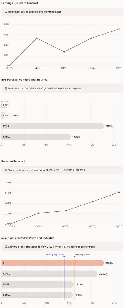 - Investor outlook: Analysts rate S as “Buy,” with a mean price target of $23.53, 37% above its current price. Revenue growth of 21.62% YoY is forecasted, exceeding industry averages. However, declining net profit margins and negative Return on Equity (-17.68%) may concern investors.