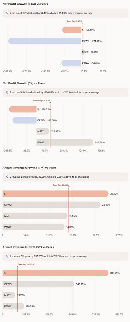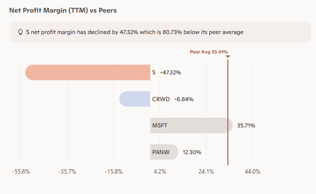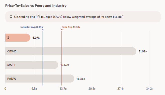 - Benchmark comparison: S outperformed the Dow Jones (+0.6%) but underperformed the S&P 500 (+1.39%) and NASDAQ Composite (+2.16%). Among peers, S underperformed CrowdStrike (+2.25%), Microsoft (+1.78%), and Palo Alto Networks (+1.48%).