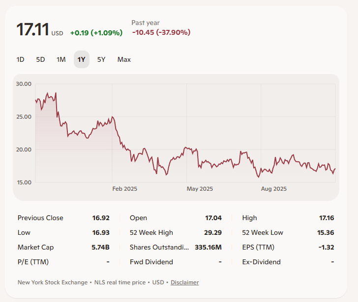- Price performance: SentinelOne Inc (S) is trading at $17.12, up 1.18% during market hours, with a volume of 1.63M shares. The stock’s market cap stands at $5.74B, reflecting moderate investor activity today.